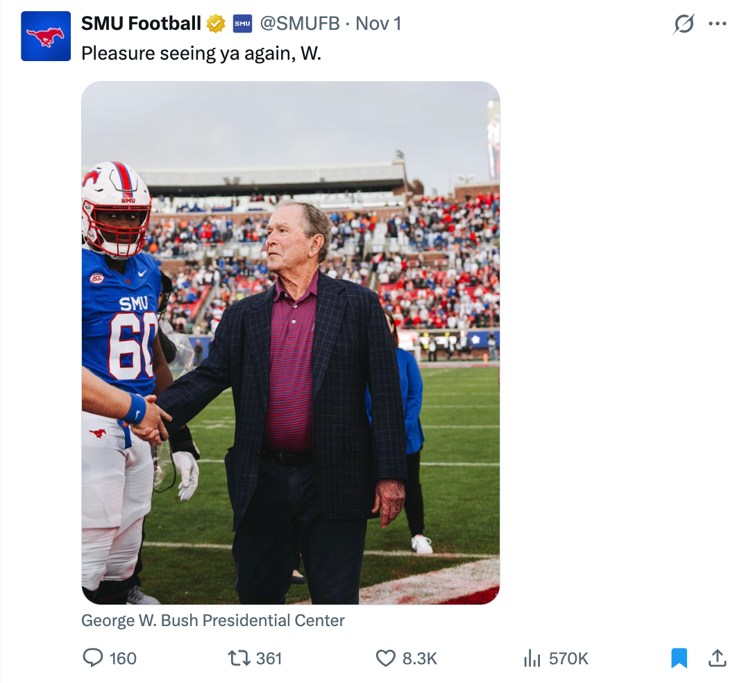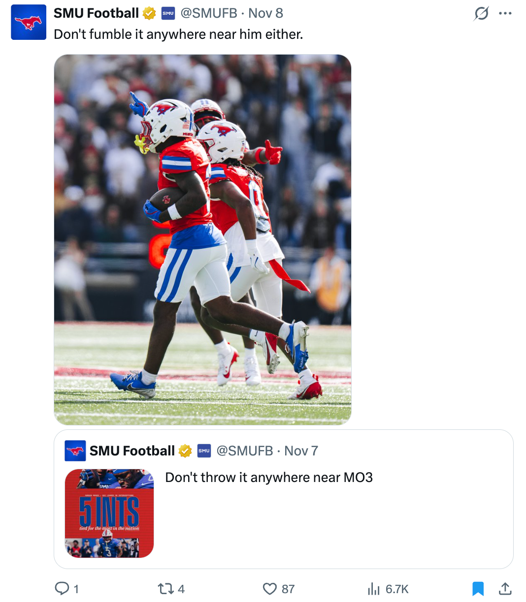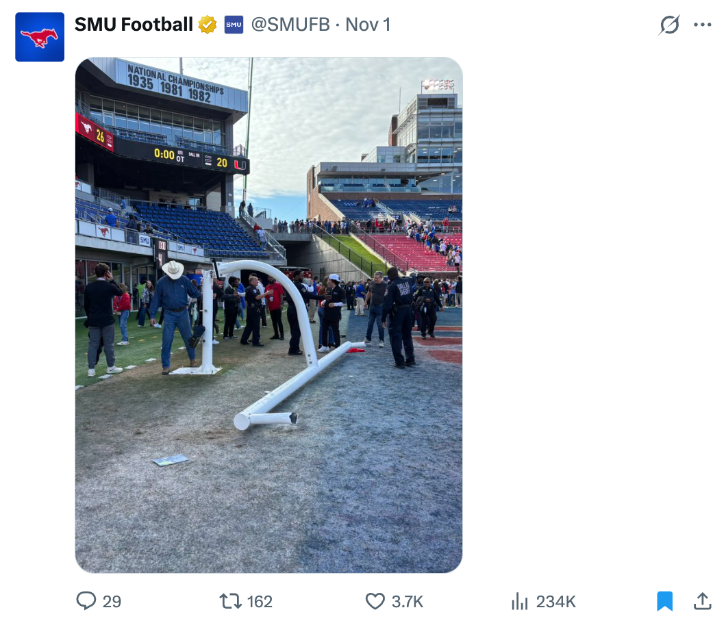 This post, a follow-up to a meme created after a uniform reveal, amassed over 30,000 likes and 10 million impressions. Despite a loss on the field and our significantly smaller following than most other playoff teams, the SMU Football X accounts totaled more impressions during the first round than each of the other CFP contestants.