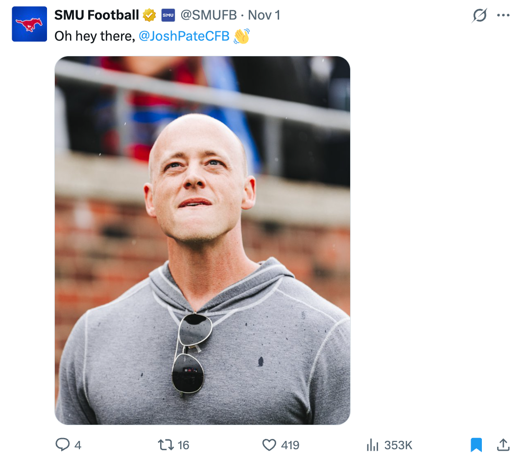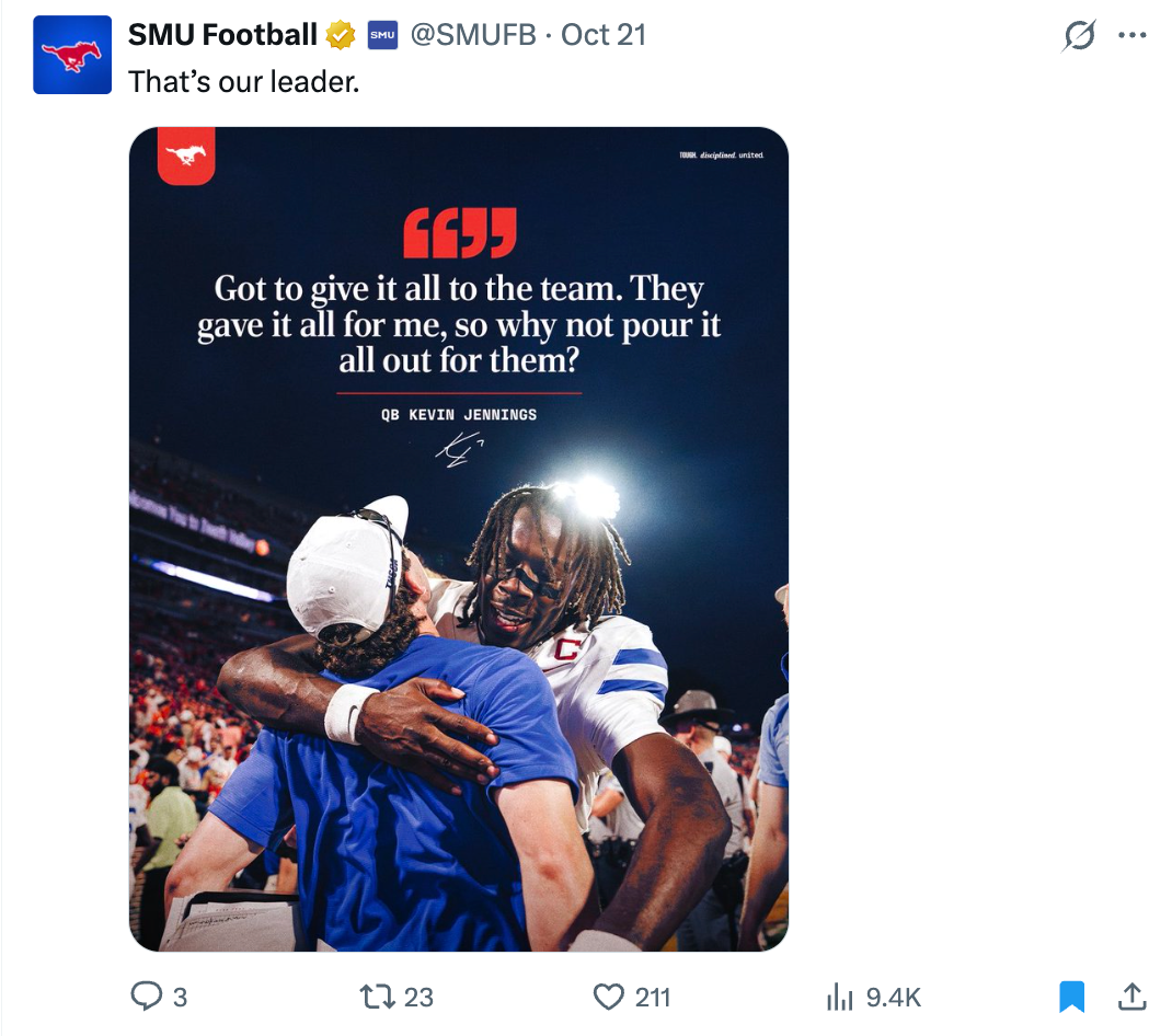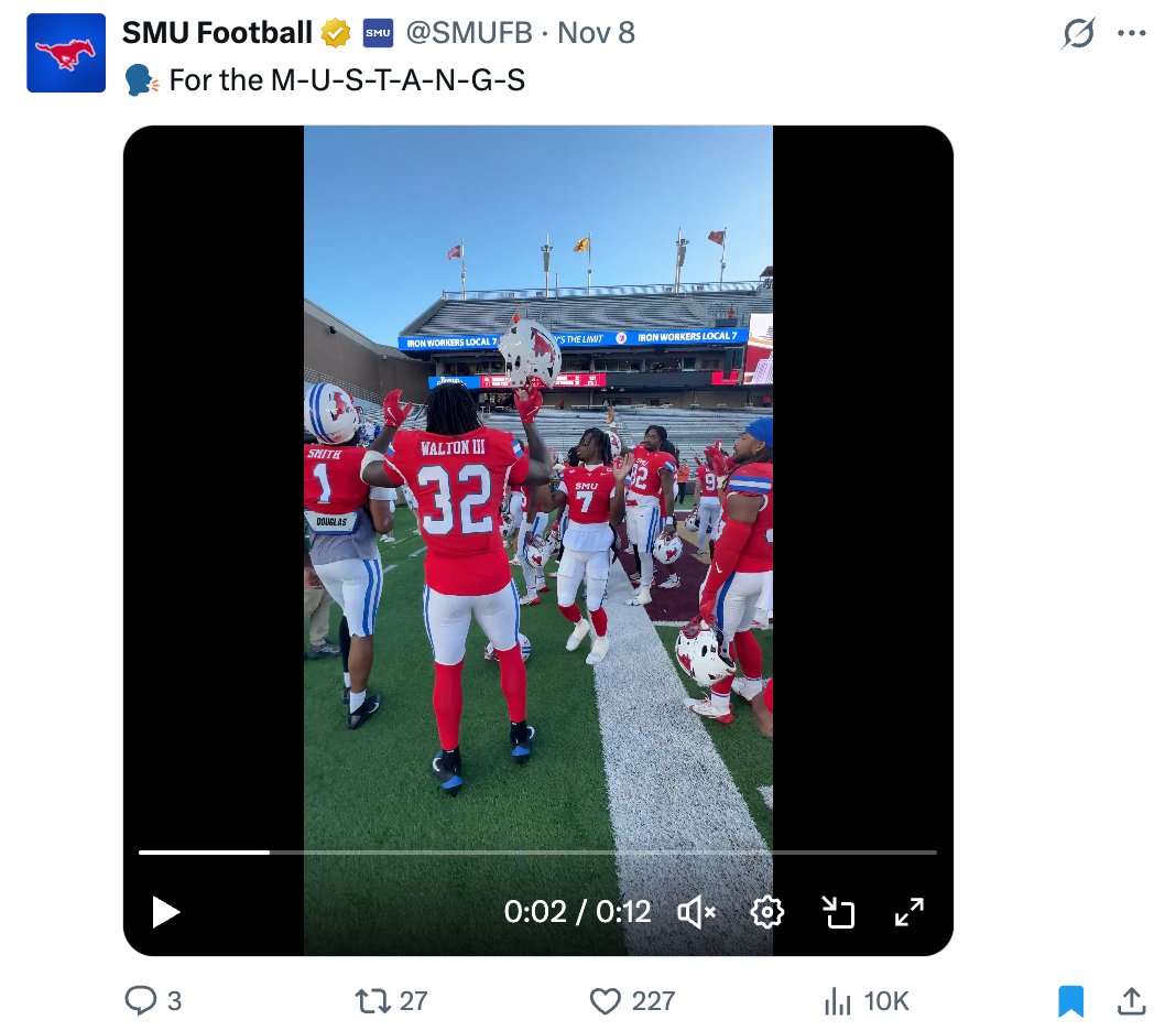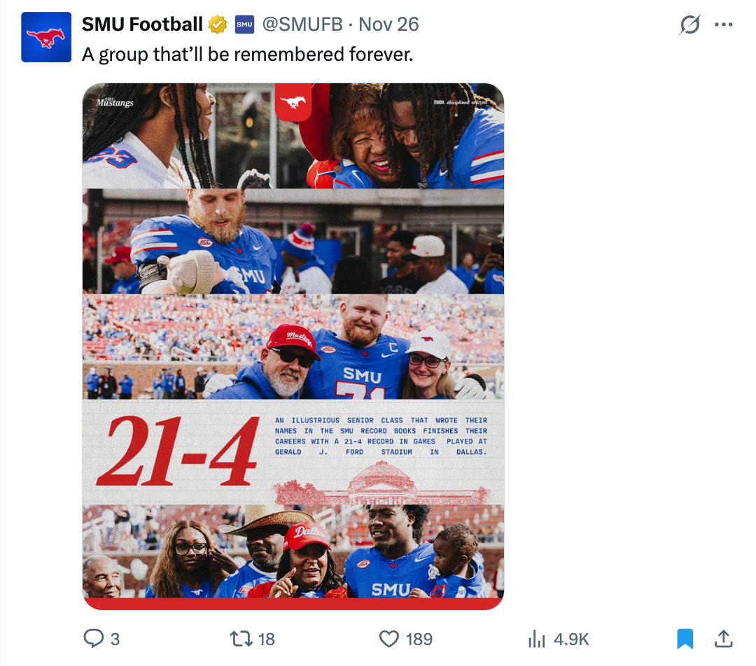 Immediately following the announcement that SMU had secured the final spot in the College Football Playoff, this was the first post that went live from the team accounts. The post totaled over 77,000 likes and 3.4 million impressions on X.